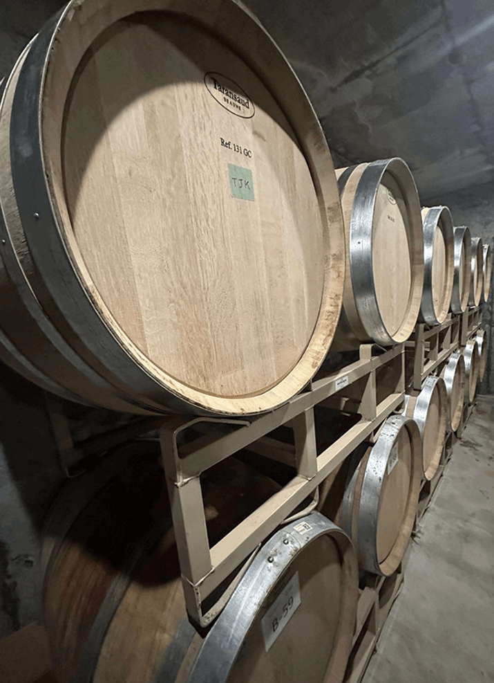 その後、野生酵母で発酵するのを気長に待ち、12月頃に発酵が終わると、脚で踏んでプレス機にかけ、樽に入れるという、簡便な手法が用いられています。
